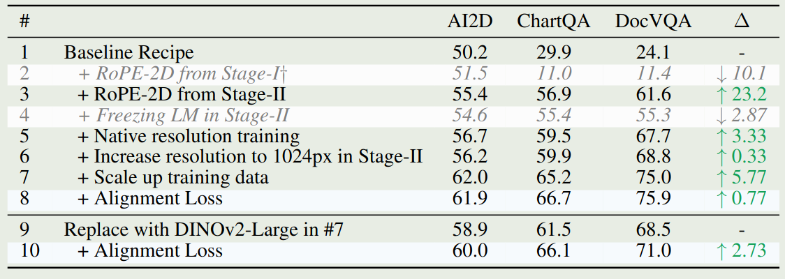 作者还对 training recipe 进行的消融实验,结果如下,可以看到,RoPE-2D 对模型表现提升最大,数据量和动态分辨率图片输入次之